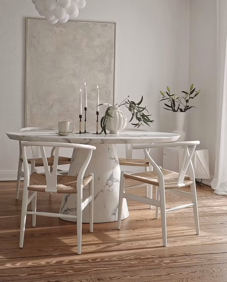 This table is made of coated marble. All our tables in the Coated Marble Category have a marble core and a laminated surface. The smooth marble is treated during a multi-step-process carefully developed to protect the stone against acidic substances. By adding a laminate layer and an extra strong resin protection we create a very durable surface that can withstand everyday use. This step of the process also includes the creation of a finish to achieve the right whiteness and apply the desired marble pattern. This makes it possible to continuously deliver tables that will always live up to our customers’ high expectations.