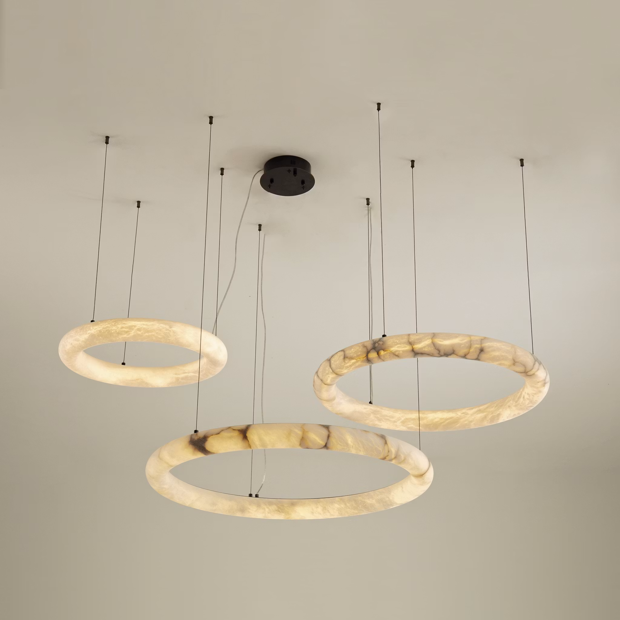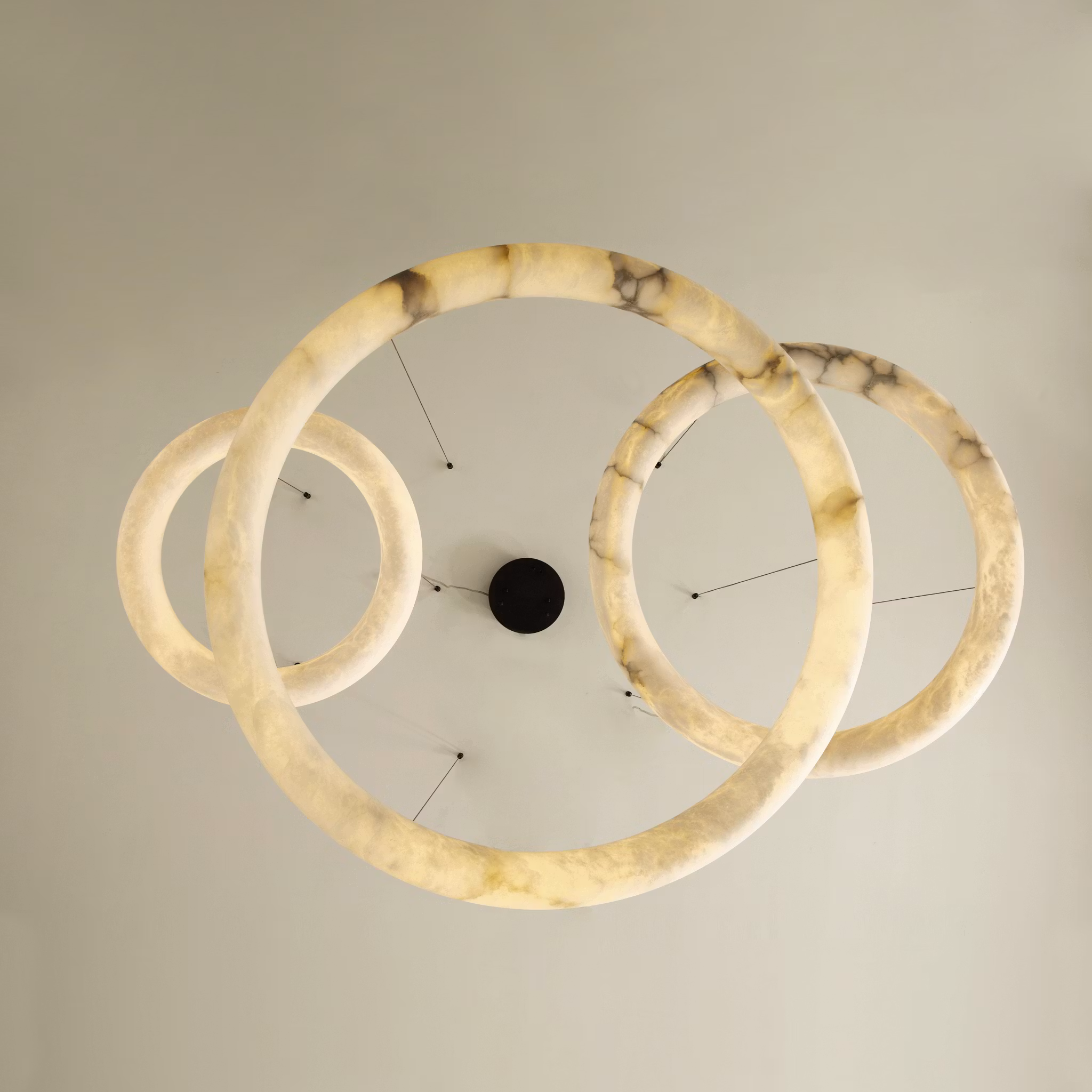 Elevate your space with the Claire Chandelier, carved from solid alabaster stone. Featuring contemporary floating ring shapes for a sophisticated aesthetic.