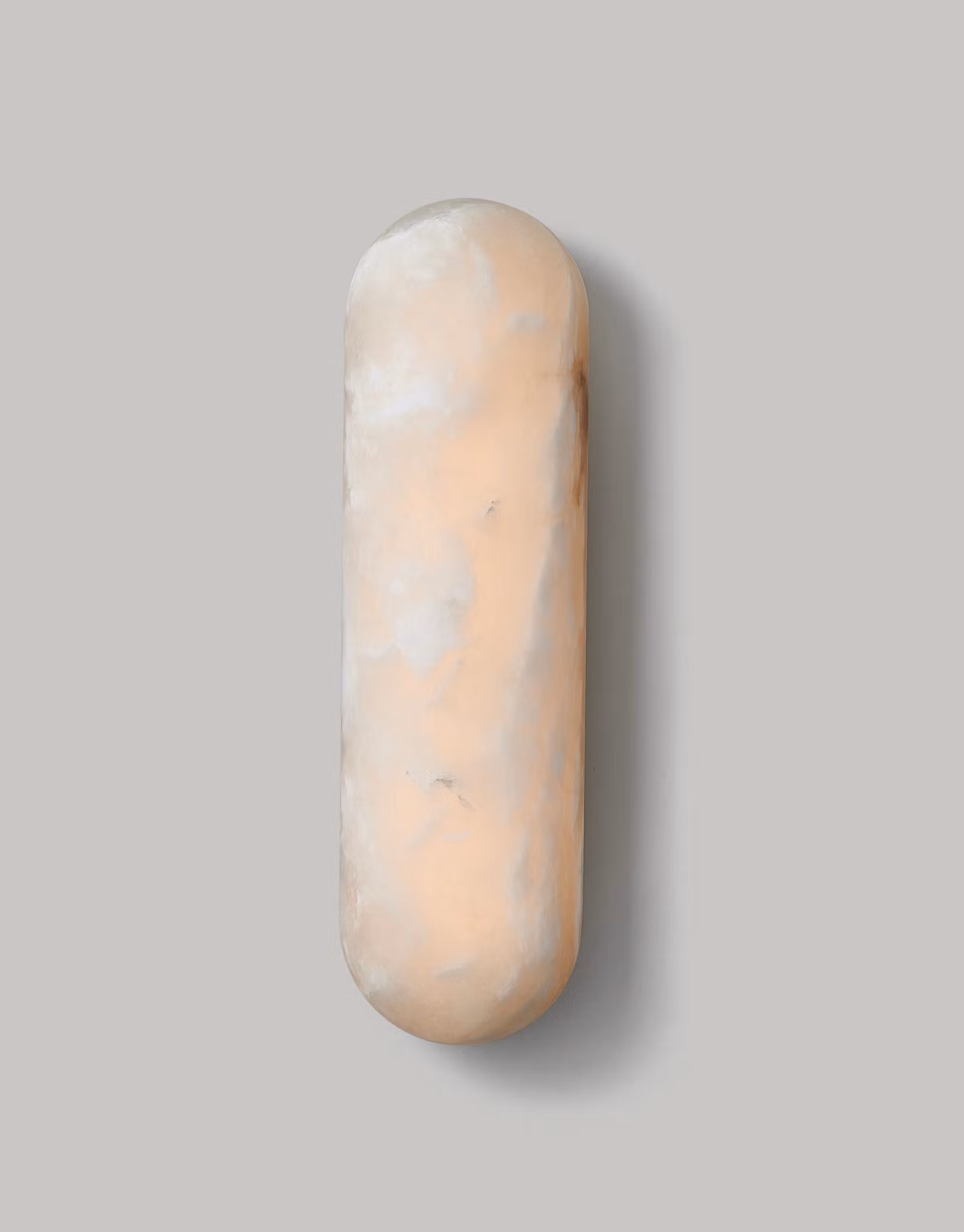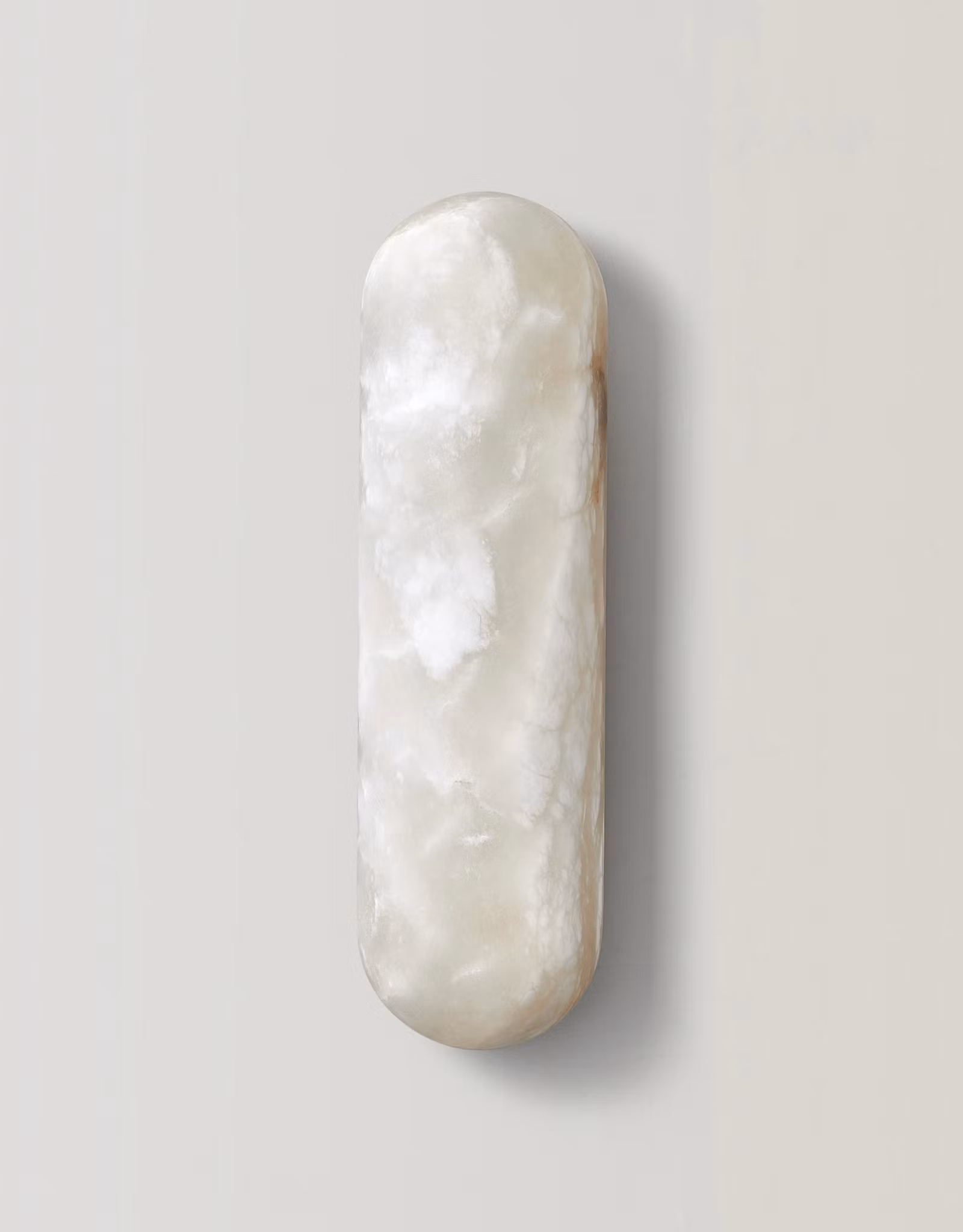 Alabaster is a natural stone, prized for its soft natural off-white coloration, translucency, and unique cloudy veining. When illuminated, the magic comes to life. The light shines through the naturally translucent stone, giving off a soft and inviting glow. You just can’t take your eyes off it. Alabaster is also loved for its smooth, fine texture and silky touch.