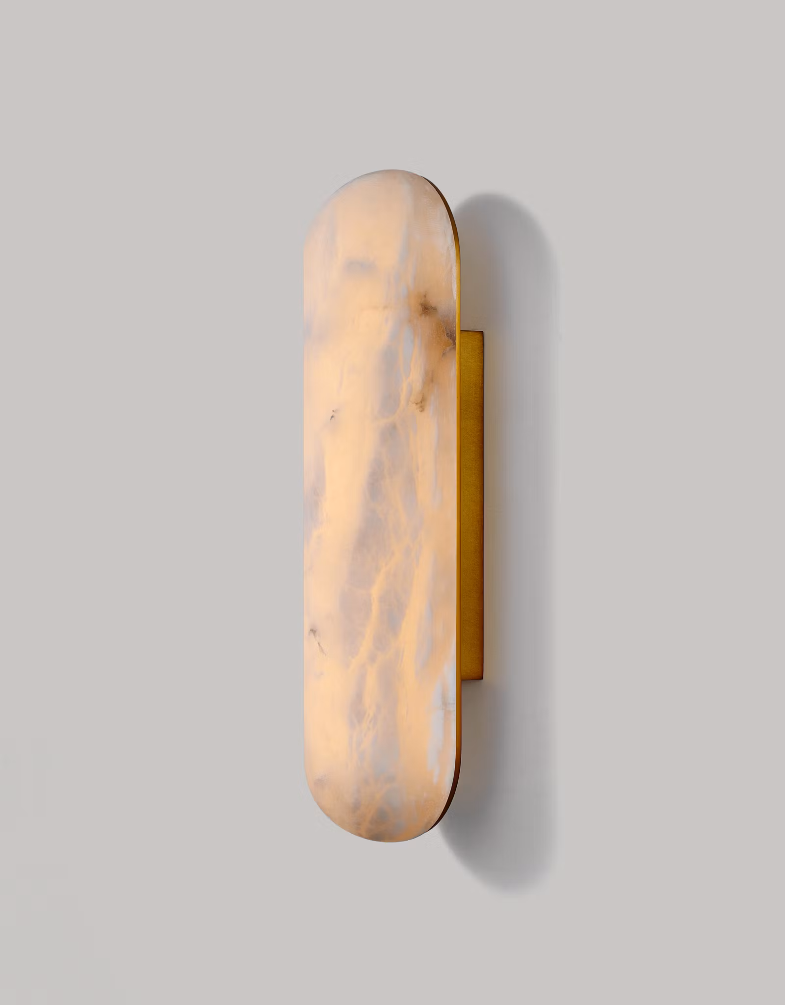 Simple, yet elegant in design, the Claire wall sconce with its delicate shapes adds an air of sophistication to any room. Brass finished hardware compliments the beauty of the stone. Suitable for a variety of rooms, whether a living space, hallway, bedroom, or dining area.